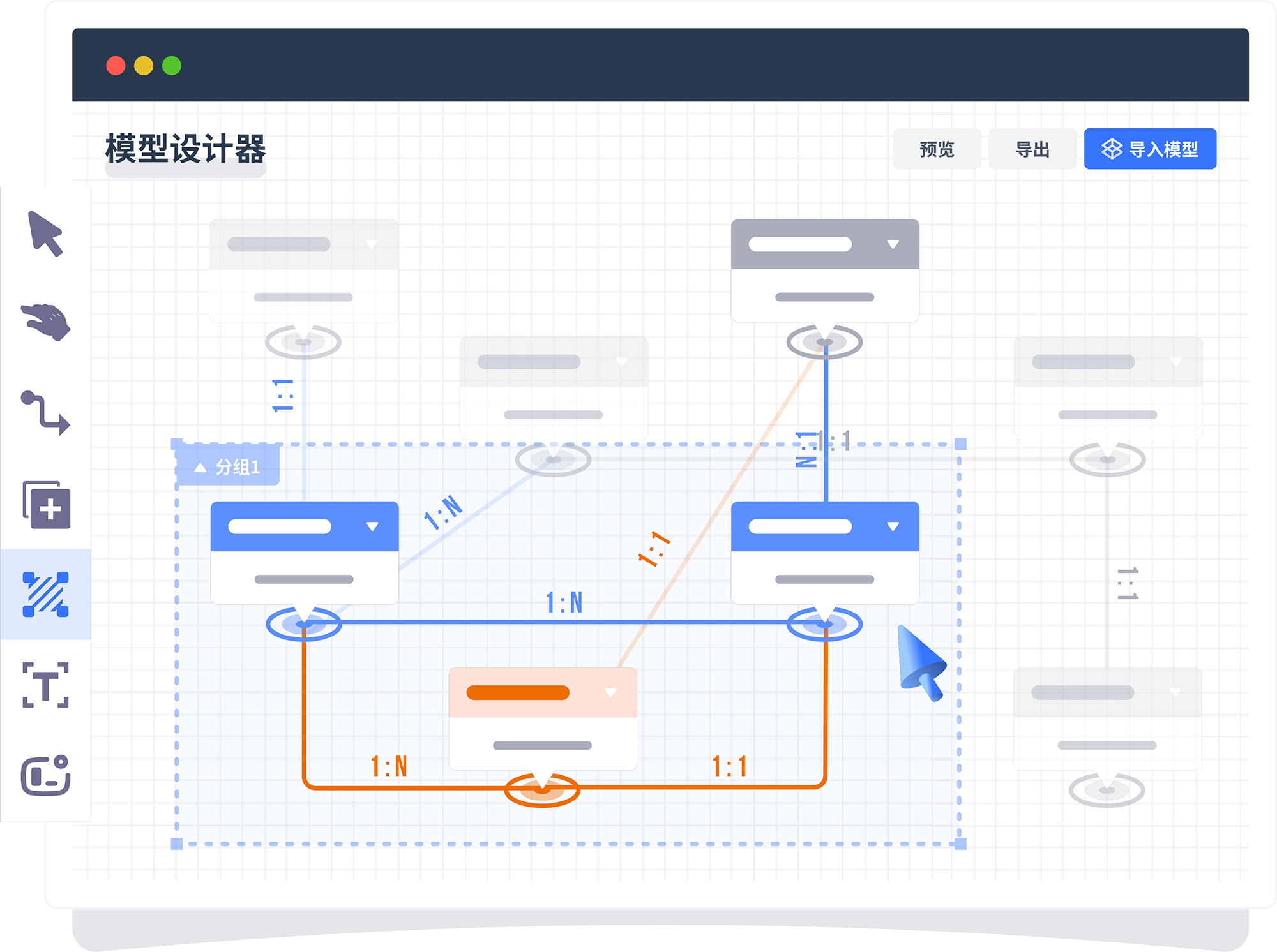 基于用户故事设计业务模型,,,采用图形化方式完成er图设计,,,支持多层分组,,,面向复杂模型也可以条理清晰,,,模型支持预览、、、导入、、、导出 。。。