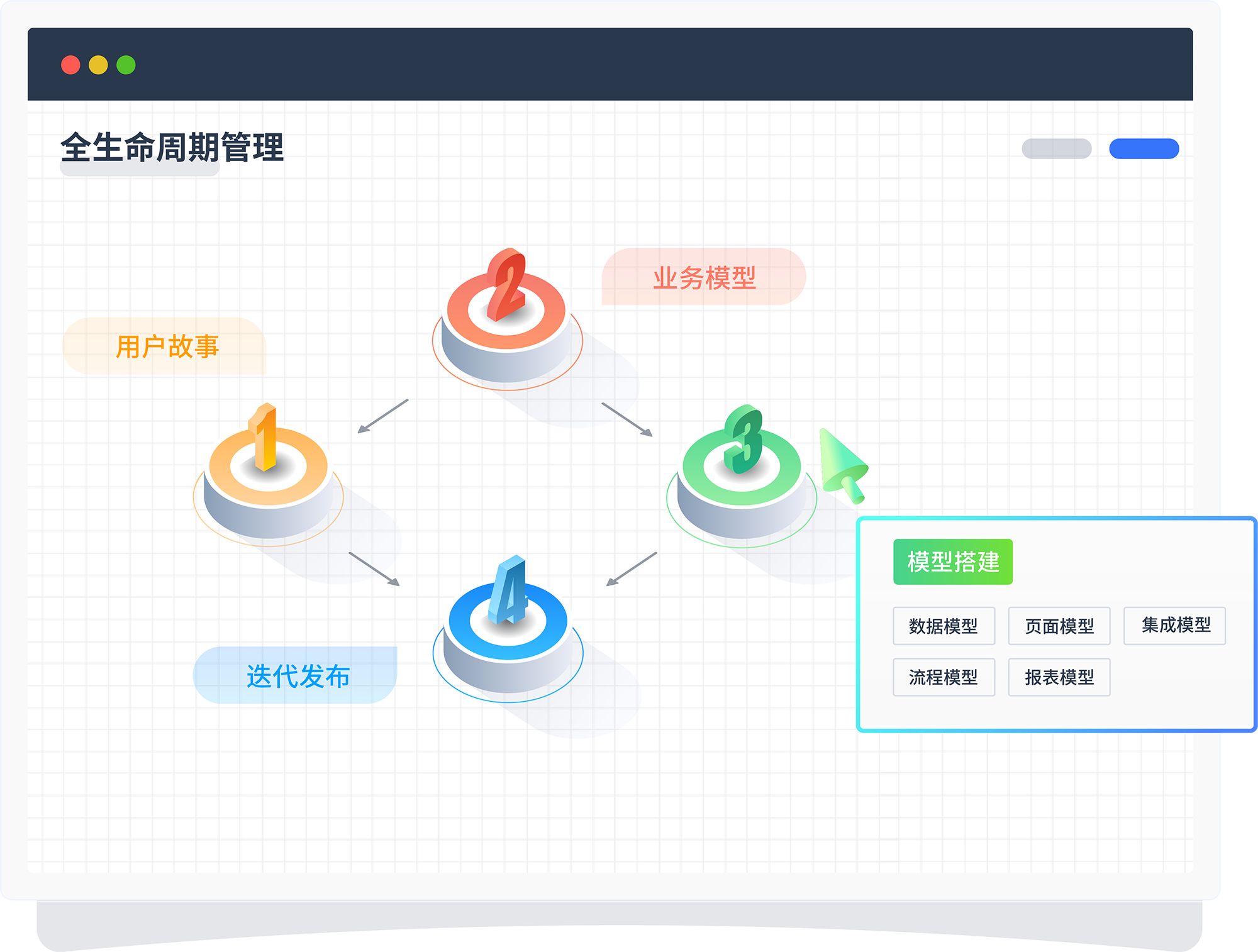 围绕产品的用户故事——模型设计/迭代——模型搭建——模型发布,,,进行系统的全生命周期闭环管理 。。。