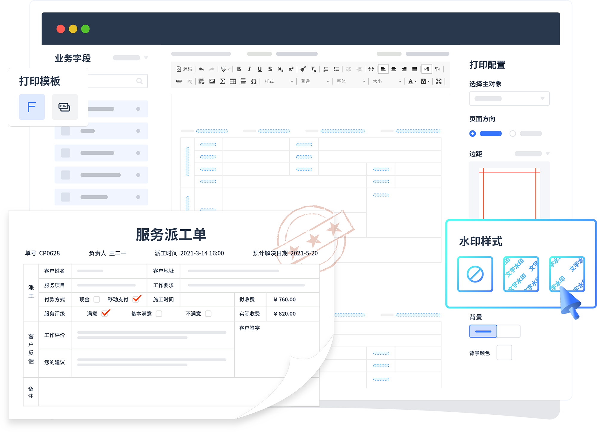 业务场景所需的打印/输出文档也支持自定义,,,关联系统内数据支持水印等辅助配置 。。。